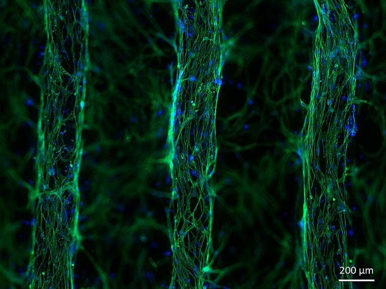 This image shows that the coculture of HUVECs and MSCs stem cells in a hydrogel can create a vascularized tissue-like structure. This is a key image of my research showing the possibility of formation of veins in the hydrogel in the laboratory.