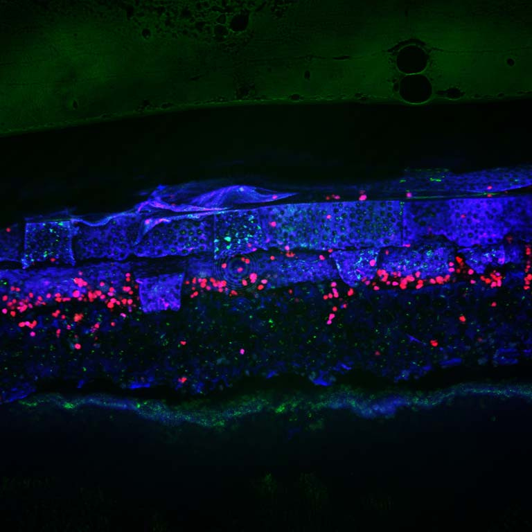 When a person has a heart attack, a portion of the heart dies. We are interested in creating thick engineered heart tissue with blood vessels that can be used as a bandage on the heart to help repair the damaged tissue. This image shows the cross section through a 3D polymer scaffold that we created (blue) that holds both heart cells (red) and vascular cells (green). Though the heart cells were placed on the top of the scaffold and the vascular cells were placed on the bottom of the scaffold, this image shows that they are moving towards each other during co-cultivation with fluid flow in the lab.