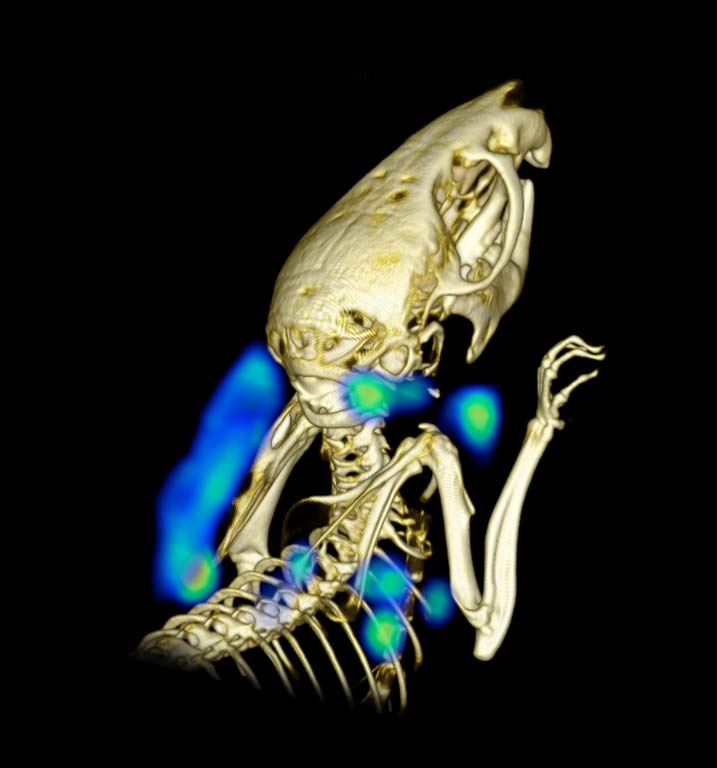 Tumors are often surrounded and invaded by bone marrow-derived cells. Imaging the infiltration of such immune cells into tumors may therefore be an attractive means of detecting tumors or of tracking the response to anticancer therapy. We show that it is possible to detect these cells noninvasively by positron emission tomography (PET) via the surface markers displayed by them. What we are seeing in the mouse is its lymph nodes (small circles) and the tumor (on the left-back shoulder).