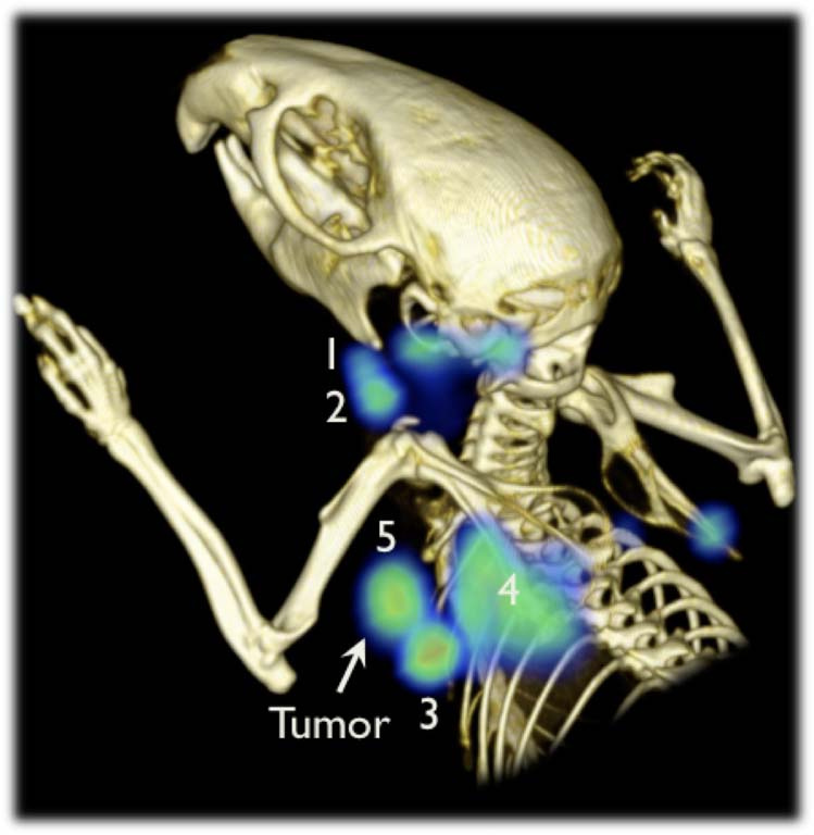 Tumors are often surrounded and invaded by bone marrow-derived cells. Imaging the infiltration of such immune cells into tumors may therefore be an attractive means of detecting tumors or of tracking the response to anticancer therapy. We show that it is possible to detect these cells noninvasively by positron emission tomography (PET) via the surface markers displayed by them. What we are seeing in the mouse is its lymph nodes (small circles) and the tumor (on the left-back shoulder).