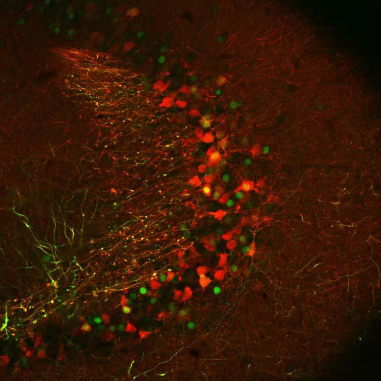 Memory is a central function of the brain and is essential to everyday life. Recently, our lab developed a novel genetic approach that allows us to visualize cells in the mouse brain that store one memory trace, known as memory engram cells. This image represents two-memory cell populations labeled with green and red proteins respectively in the emotional center of the brain, the amygdala. By understanding the contribution of brain cells that store a single memory trace, we hope to provide insights into how humans form and recall memories with high accuracy.