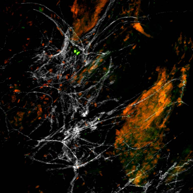 The image shows typical tumor tissue: cancer cells (unlabeled) and collagen fibers (grey) being perfused by leaky blood vessels (red). A novel strategy to fight cancer is to use nanoparticles as delivery vehicle for therapeutics. We study how these nanoparticles (red) leak out of these vessels and how we can help them go deeper into the tissue using tiny magnetic propellers (green), and thus, how to make therapy become more effective.
