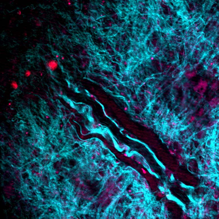 The image shows typical tumor tissue: cancer cells (unlabeled) and collagen fibers (cyan) being perfused by leaky blood vessels (black/purple). A novel strategy to fight cancer is to use nanoparticles as delivery vehicle for therapeutics. We study how these nanoparticles (purple) leak out of these vessels and how we can help them go deeper into the tissue using tiny magnetic propellers (pink), and thus, how to make therapy become more effective.
