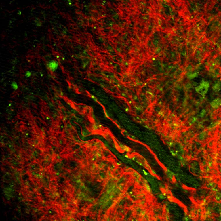 The image shows typical tumor tissue: cancer cells (unlabeled) and collagen fibers (red) being perfused by leaky blood vessels (black/green). A novel strategy to fight cancer is to use nanoparticles as delivery vehicle for therapeutics. We study how these nanoparticles (green) leak out of these vessels and how we can help them go deeper into the tissue using tiny magnetic propellers (green/yellow), and thus, how to make therapy become more effective.