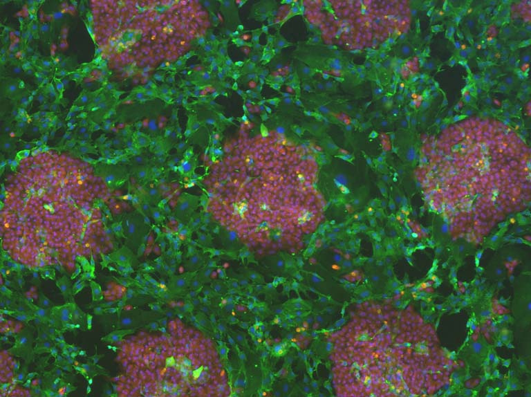 "These images show liver cells (hepatocytes) grown in pre-patterned islands on a glass coverslip. The liver cells are stained in red and adjacent supportive cells (fibroblasts) are stained in green. A major goal of my research is towards generating a renewable and expandable source of human hepatocytes grown in culture. A renewable source of human hepatocytes would greatly aid efforts towards in regenerative medicine, disease modeling, personalized medicine, and drug screening."