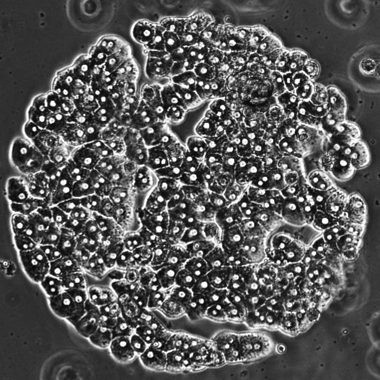 "These images show liver cells (hepatocytes) grown in pre-patterned islands on a glass coverslip. The liver cells are stained in red and adjacent supportive cells (fibroblasts) are stained in green. A major goal of my research is towards generating a renewable and expandable source of human hepatocytes grown in culture. A renewable source of human hepatocytes would greatly aid efforts towards in regenerative medicine, disease modeling, personalized medicine, and drug screening."
