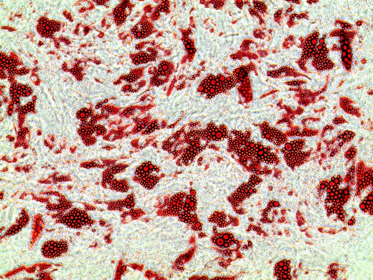 In our research, we developed an artificial bone microenvironment which allows us to culture stem cells or any other types of cells and visualize how these cells react to a given stimuli, without using any live human or animal subjects. This image was one of the images we took to confirm how many of the stem cells that we cultured had turned into adipose cells in our artificial bone environment with certain drugs added.