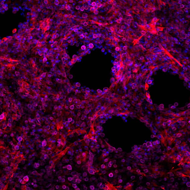 The immune system does a very good job at identifying what is foreign to our body and does its best to protect us from any intruder. When a biomaterial is implanted, the immune system jumps into action and deposits a layer of cells and protein matrix on the material through a process known as fibrosis. The images capture this process of fibrosis in action. At least two major players of fibrosis – macrophages (rounded) and fibroblasts (stretched, fiber like) can be seen in these pictures.