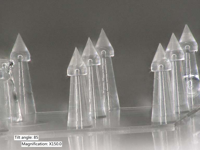 In the picture we can see some microneedles, a series of arrow-shaped projections, standing on a base that joints them together. These 3D-printed microneedles are very small, less than 1 mm in height, and are used to produce molds which will allow their replication. Ultimately, microneedles made of biodegradable and biocompatible polymers will be used for drug delivery as an alternative to conventional needles.