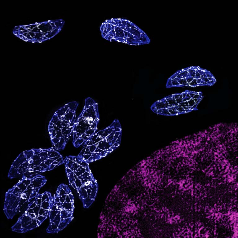 I have three images showing the lifecycle of intracellular pathogen Toxoplasma gondii. Although only around 1/20th the size of a human hair, these single celled parasites replicate by building two daughter cells which grow before bursting out of the mother. I am interested in this process and the proteins required for forming and maintaining the structure of the parasite during its division. In this image, the human cell nucleus is shown in purple, giving an indication of scale.