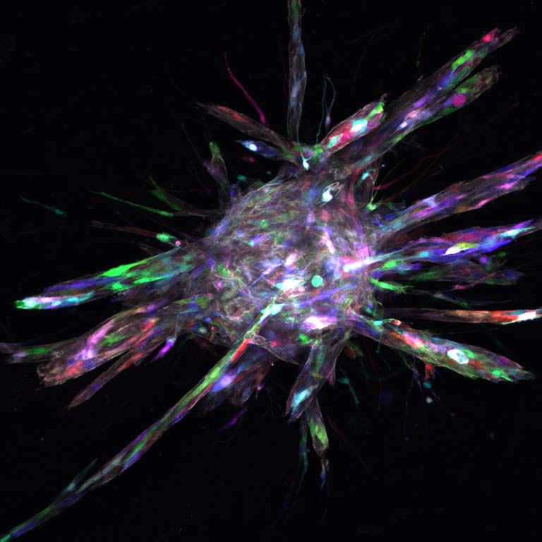 We grew rainbow labeled human breast tissue into mini-organs in our 3D growth system. By following all the daughter cells that come from a single cell using a color tracking system over time, we can see how cells at a specific time contribute the human mammary gland development.