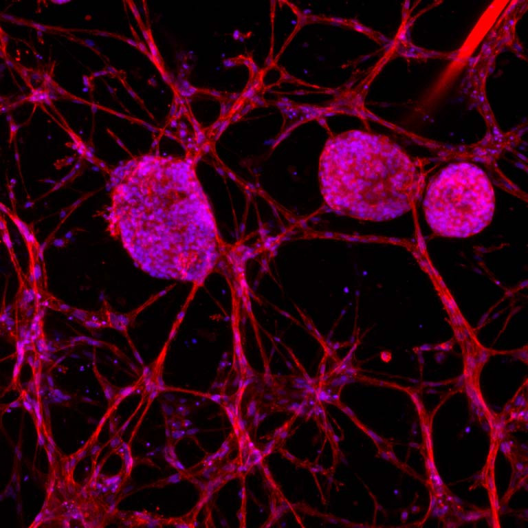 Pancreatic islets are directly responsible for regulating blood glucose levels and are implicated in a variety of diseases most notably Diabetes. Islets in the body are surrounded by a very complex environment and are highly vascularized. The vessels feeding the islets are not only important in maintaining islet viability, but also play crucial signaling roles for proper islet function. Studying islet physiology and developing drugs to cure diabetes requires a physiologically accurate culture model. To this end the images here display the first ever demonstration of vascularizing pancreatic islets in vitro.