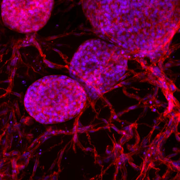 Pancreatic islets are directly responsible for regulating blood glucose levels and are implicated in a variety of diseases most notably Diabetes. Islets in the body are surrounded by a very complex environment and are highly vascularized. The vessels feeding the islets are not only important in maintaining islet viability, but also play crucial signaling roles for proper islet function. Studying islet physiology and developing drugs to cure diabetes requires a physiologically accurate culture model. To this end the images here display the first ever demonstration of vascularizing pancreatic islets in vitro.