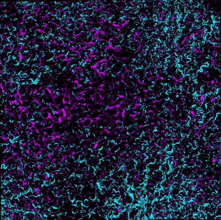 It is a highly zoomed-in picture of a mouse lung. The connective tissue (collagen) appears in [blue]. The blood vessels are visible in [purple]. They turned red after treatment with a new drug carrier (lipid nanoparticle) that can deliver drugs or gene therapy agents to the blood vessels of the lung. This technology can be used to deliver drugs to the lung to treat a variety of diseases including cancer.