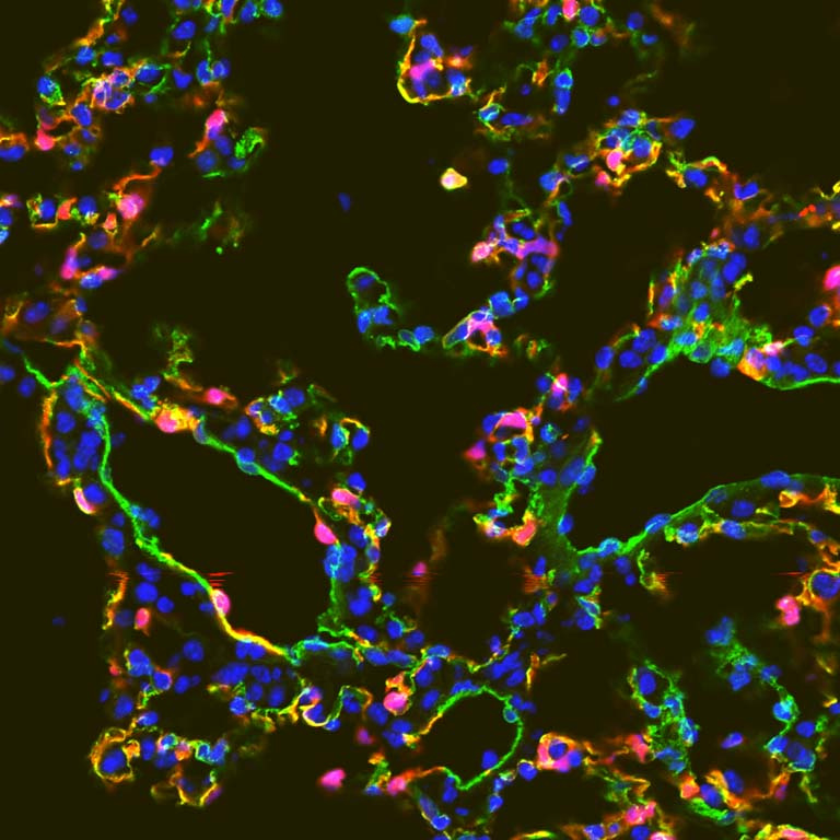 Harnessing the power of nanotechnology to deliver messenger RNA to lung tissues. Images show polymeric nanocarriers that can carry messenger RNA to lung vasculature. Red cells received mRNA nanoparticles and transcribed the instructions encoded into mRNA to a protein. Green depict vascular endothelial cells, cell nuclei are stained in blue. Yellow color indicates co-localization of green and red signals. We generated this images using transgenic mice with a red fluorescent protein (TdTomato) preceded by a STOP signal inserted into their genomic DNA. TdTomato will be expressed only by the cells that received mRNA coding for Cre recombinase enzyme that removes the STOP signal. This technique allows us to visualize nanoparticle mediated mRNA delivery to various tissues with great sensitivity.
