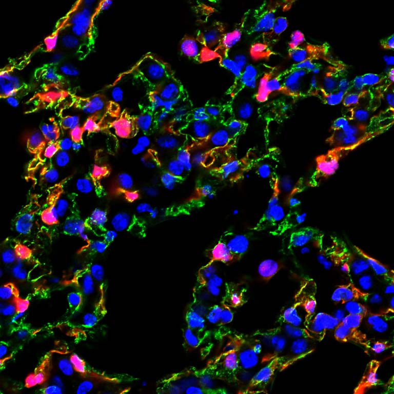 Harnessing the power of nanotechnology to deliver messenger RNA to lung tissues. Images show polymeric nanocarriers that can carry messenger RNA to lung vasculature. Red cells received mRNA nanoparticles and transcribed the instructions encoded into mRNA to a protein. Green depict vascular endothelial cells, cell nuclei are stained in blue. Yellow color indicates co-localization of green and red signals. We generated this images using transgenic mice with a red fluorescent protein (TdTomato) preceded by a STOP signal inserted into their genomic DNA. TdTomato will be expressed only by the cells that received mRNA coding for Cre recombinase enzyme that removes the STOP signal. This technique allows us to visualize nanoparticle mediated mRNA delivery to various tissues with great sensitivity.