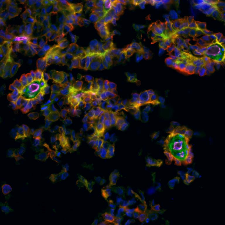 Ovarian cancer is a deadly disease, and clinicians are actively seeking new technologies to treat these patients. This image shows a ‘slice’ of human tumors that were grown in a mouse model of ovarian cancer. Our long-term goal is to deliver medicines to these tumors, by designing tiny nanoparticles that can specifically target and bind to these cancers using molecular “velcro”. In order to build the best nanoparticles for the job, we needed to learn what sort of velcro partners would stick to this kind of tumor. In our image, the pink color marks blood vessels, which are the “highways” through which our nanoparticles would travel through, and the red and green staining shows where the candidate molecular vecro components appear in the tumor. Yellow coloring indicates that the red and green components overlap, and blue is used to mark any cells in the image.
