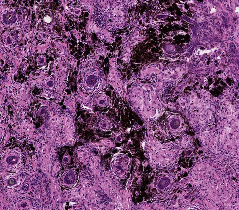 These H&E images depict melanomas undergoing immunotherapy treatment. The images show high infiltration of lymphocytes, the immune system’s effector cells against tumors, in a mouse melanoma model that is considered very challenging. In this images, swarms of lymphocytes can be identified by their small, dense nuclei, and pockets of brown melanin produced by the tumor can be seen throughout.