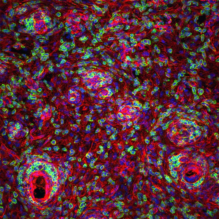 These immunofluorescence images depict melanomas undergoing immunotherapy treatment. The images show high infiltration of CD8 T cells (in green), the immune system’s primary effector cell against tumors, in a mouse melanoma model that is considered very challenging. Nuclei are shown in blue, and actin is stained in red to visualize tumor structure. Tumors that are untreated do not have evident CD8 T cell infiltration.