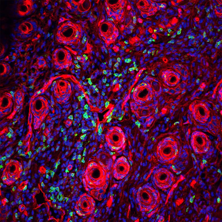 These immunofluorescence images depict melanomas undergoing immunotherapy treatment. The images show high infiltration of CD8 T cells (in green), the immune system’s primary effector cell against tumors, in a mouse melanoma model that is considered very challenging. Nuclei are shown in blue, and actin is stained in red to visualize tumor structure. Tumors that are untreated do not have evident CD8 T cell infiltration.