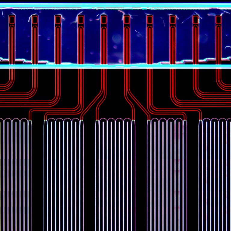 Single cells vary widely in their growth rates, a fundamental behavior that reflects differences between cells and may govern their relative abundance within a population. From bacteria to human cells, even genetically identical cells grow at different rates. This variation is hard to observe via population-based assays but has important consequences for human health. For example, cancer cells within an individual may vary drastically in proliferative potential, with subsets capable of continuous cell divisions and others primarily stationary. Or growth-rate variation in bacterial populations can dictate the efficacy of antibiotic treatments, as slow or non-growing cells tend to be more resistant to antibiotics. This is a micrograph of a microfluidic chip that enables fast and precise measurement of single-cell growth. The chip integrates an array of extremely sensitive mass sensors (seen at the top as cantilever structures) to measure the growth of individual cells. As cells travel through a long microfluidic channel (seen as serpentine channels between the mass sensors), they get weighed multiple times in the cantilevers. High throughput measurements of single-cell growth help us to track the time-varying responses of cells to changing environmental conditions. Therefore it holds promise for fast drug susceptibility tests for bacterial populations and predicting tumor responses after drug exposure.