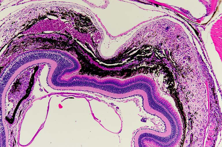 The picture above displays a representative example of tumors developing in the eye of our transgenic zebrafish model of UM. Based on the view from this angle of incision, the normal anatomy of the zebrafish eye will begin with the lens at the left side (or bottom in this picture) and proceed across the retina in ordered layers of various nerve and photoreceptor cells before finally ending in two pigmented cell layers. It is in the second of these pigmented layers, called the choroid, that the cancer forms in both the human malignancy and in the transgenic fish pictured. In the effort to study and understand this disease, the occurrence of tumors such as these not only substantiates our model, but provides a platform in which we may elucidate the mechanisms behind this malignancy.
