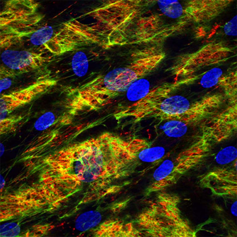 In the body, stem cells are surrounded by a complex 3D network of proteins, called the extracellular matrix, that provides the cells with vital signals that regulate their function. During cell culture, stem cells are removed from this native home, and need to adapt to a relatively foreign environment, that is, tissue culture plastic. Tissue culture plastic is fully synthetic, does not present standard ECM signals and mesenchymal stem cells on tissue culture plastic start to produce proteins to build a new home. Cells are able to assemble an extracellular matrix over the course of two weeks, and this image shows mesenchymal stem cells embedded in complex networks of ECM proteins after ten days of in vitro culture.
