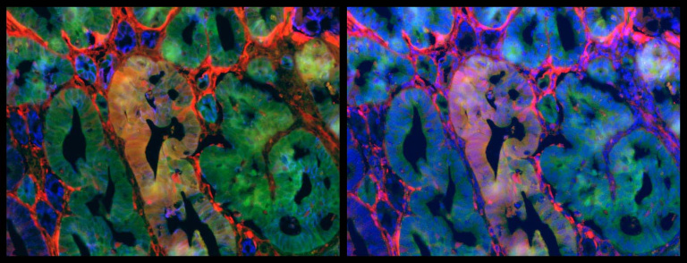 Generating mice with cancer is often time consuming and difficulty because of the need for genetic mutant mice. For this project, we deleted the Apc gene directly in the mouse colon using colonoscopy and the gene editing tool called CRISPR/Cas9. In this image, colon epithelial cells (those cells that are able to develop into tumors) are shown in green, while stromal cells (which cannot form colon tumors) are bright red. The colon tumor is yellow and arises from the epithelial cells (i.e., combination of red and green). This model is important because it allows us to directly and efficiently edit genes in the adult mouse colon. In the right image, the same tumor section is imaged with a nuclear stain (which is blue) instead of an epithelial stain (which is green in the left image).