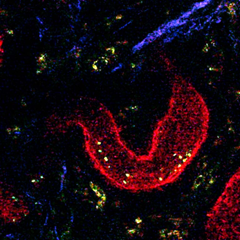 The images show a typical vascularized tumor tissue with cancer cells (unlabeled), collagen matrix (purple/white) and blood vessels (red). A novel strategy to fight cancer is to use tumor-seeking bacteria that can be modified to produce and release cancer toxins. A certain type of bacteria can even produce little magnetic particles in their body that make them respond to external magnetic fields, and also allow us to track them in the body using MRI. We study how such living therapeutic microorganisms (green/yellow) move in these vessels and how we can help them go deeper into the tissue using dynamic magnetic fields to make therapy become more effective.