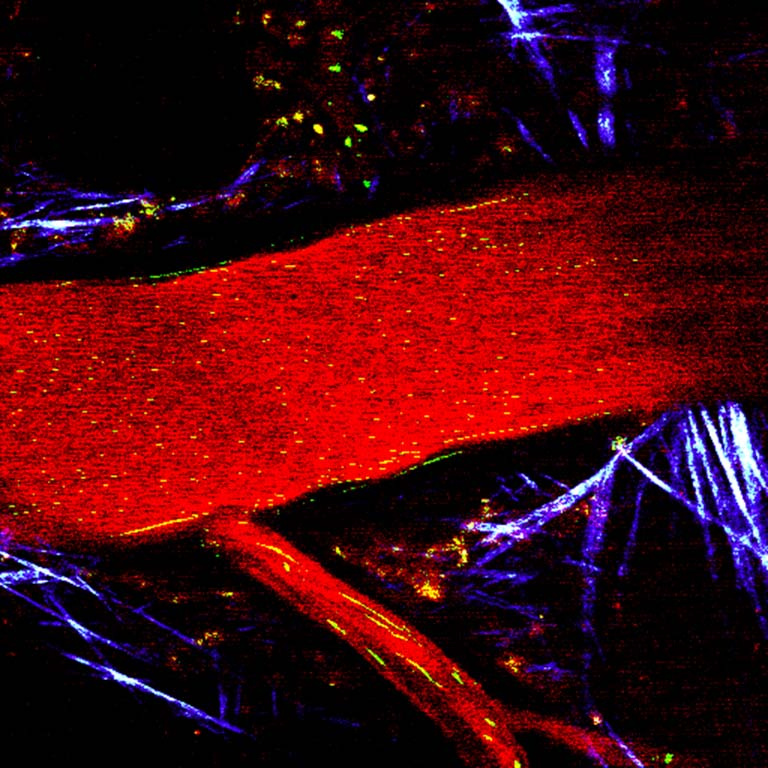 The images show a typical vascularized tumor tissue with cancer cells (unlabeled), collagen matrix (purple/white) and blood vessels (red). A novel strategy to fight cancer is to use tumor-seeking bacteria that can be modified to produce and release cancer toxins. A certain type of bacteria can even produce little magnetic particles in their body that make them respond to external magnetic fields, and also allow us to track them in the body using MRI. We study how such living therapeutic microorganisms (green/yellow) move in these vessels and how we can help them go deeper into the tissue using dynamic magnetic fields to make therapy become more effective.