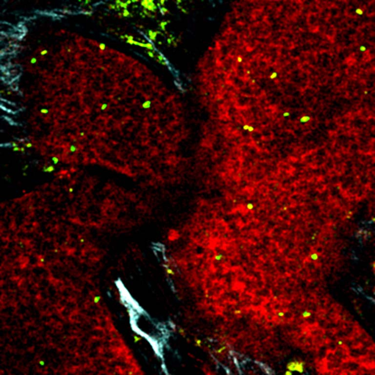 The images show a typical vascularized tumor tissue with cancer cells (unlabeled), collagen matrix (purple/white) and blood vessels (red). A novel strategy to fight cancer is to use tumor-seeking bacteria that can be modified to produce and release cancer toxins. A certain type of bacteria can even produce little magnetic particles in their body that make them respond to external magnetic fields, and also allow us to track them in the body using MRI. We study how such living therapeutic microorganisms (green/yellow) move in these vessels and how we can help them go deeper into the tissue using dynamic magnetic fields to make therapy become more effective.