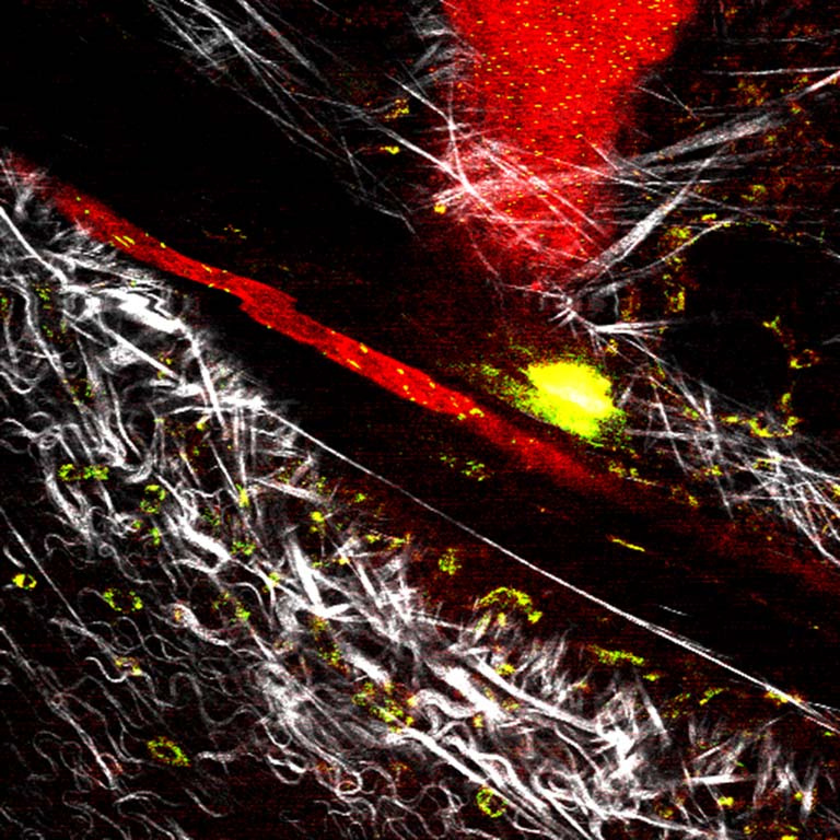 The images show a typical vascularized tumor tissue with cancer cells (unlabeled), collagen matrix (purple/white) and blood vessels (red). A novel strategy to fight cancer is to use tumor-seeking bacteria that can be modified to produce and release cancer toxins. A certain type of bacteria can even produce little magnetic particles in their body that make them respond to external magnetic fields, and also allow us to track them in the body using MRI. We study how such living therapeutic microorganisms (green/yellow) move in these vessels and how we can help them go deeper into the tissue using dynamic magnetic fields to make therapy become more effective.