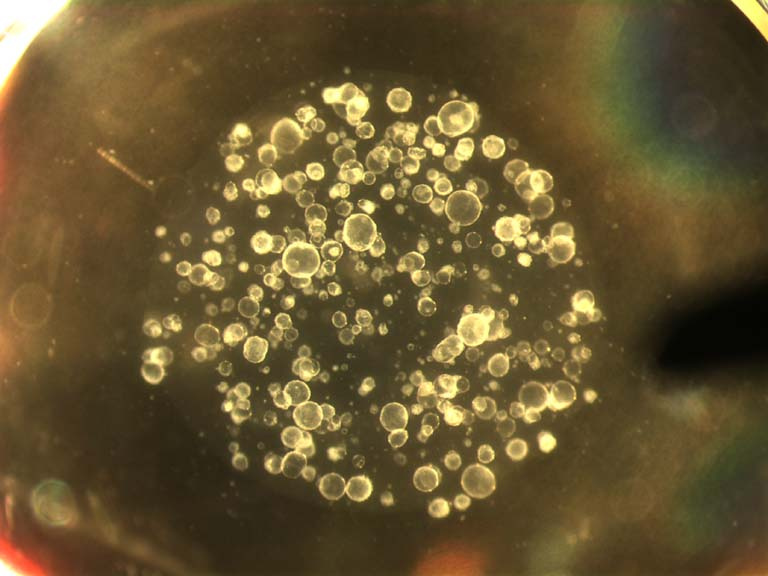 These pictures all show normal mouse prostate organoids, 3D spheres of cells that grow in a culture dish. We took these images to keep track and to study the phenotype of these organoids. This picture gives an overview of one well of organoids, showing different phenotypes (hollow and solid). The organoid culture system allows us to culture normal prostate cells, which is very hard in 2D tissue culture. Since this is such a new culture system, it was very important to get to know the behavior and the structure of these organoids.