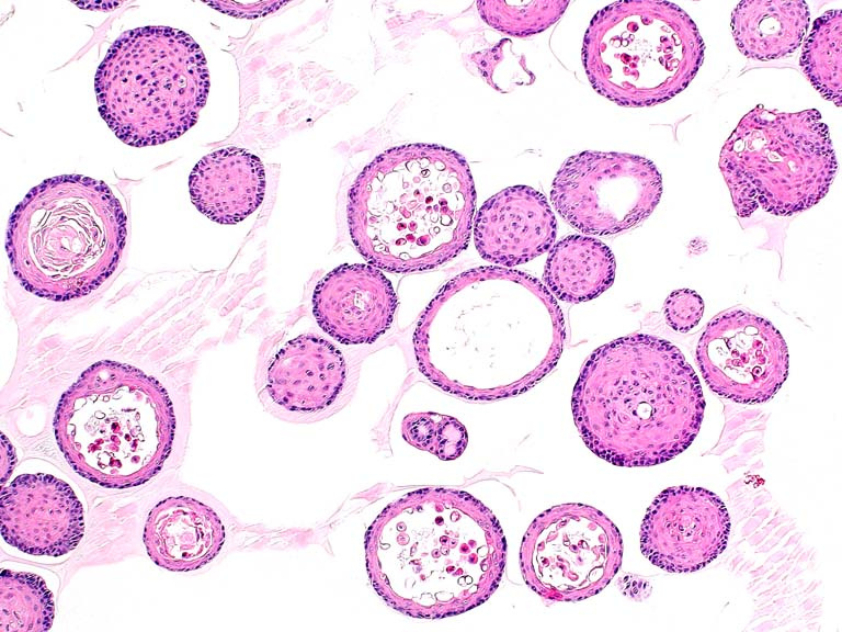 These pictures all show normal mouse prostate organoids, 3D spheres of cells that grow in a culture dish. We took these images to keep track and to study the phenotype of these organoids. The H&E stained organoids (first picture), gives a beautiful insight in their structure. The organoid culture system allows us to culture normal prostate cells, which is very hard in 2D tissue culture. Since this is such a new culture system, it was very important to get to know the behavior and the structure of these organoids.