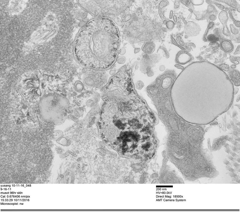 We are designing a nanomaterial-based drug delivery platform to target drugs/vaccines to lymph nodes for enhanced treatment efficacy and reduced side effects. These images showed that small gold nanoparticles (drug delivery vehicles) were found near collagen fibers in the dermis, but not near blood vessels, where most small molecule drugs were able to traverse.