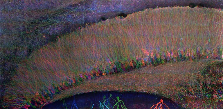 This is a piece of a mouse hippocampus, a vital part of the brain which regulates emotions and is associated with long-term memory. Thousands of neurons stained in various colors were imaged at a high resolution (60 nm) over a wide area (1 mm2), resulting in a large image with roughly 23,000 x 11,000 pixels. The image depicts large-scale and small-scale structures of the neurons simultaneously, helping us understand how the neurons, including their thin branches and tiny features, are organized in the hippocampus