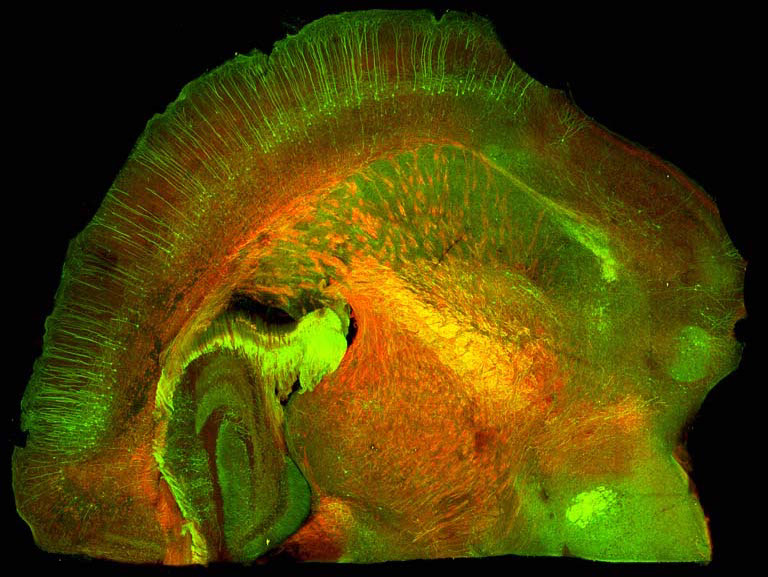 This image shows the internal structure of the mouse brain visualizing a network of the constituent neurons and their connectivity. We took this image to study how the neurons are distributed and connected to form a network for processing information and storing memory.