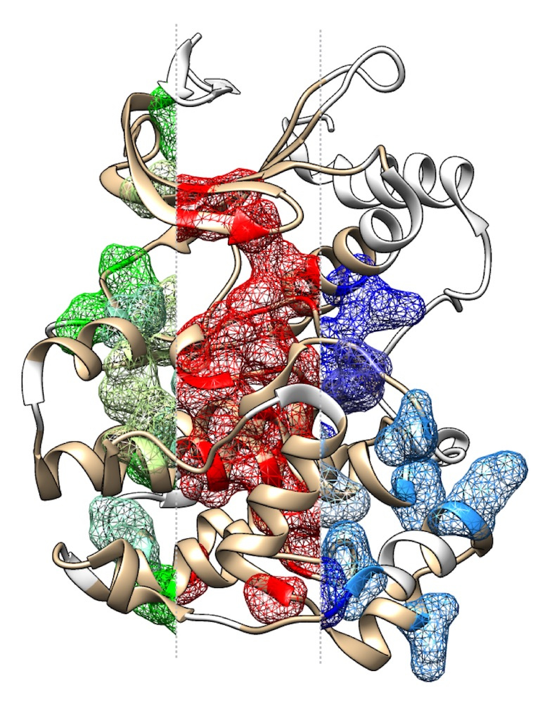 Our genomes encode thousands of proteins with multiple protein domains. Even though each protein domain is thought to perform a specific molecular function, how single protein domains such as the kinase domain (depicted in the image) are capable of performing multiple, complex functions has remained enigmatic. Using a novel computational method, named comparative coupling analysis, three distinct sets of residues (or as we call them protein sectors) performing different molecular functionalities were identified. The residues illustrated in red include the catalytic core of the kinase domain, the residues in green involve substrate specificity and residues in blue connect to sites of allosteric regulation more distant to the active site. I wanted to analyze the structural positioning of the residues forming the three different sets of residues (protein sectors) when superimposed on the structure of the kinase domain. As part of the analysis we not only considered the three protein sectors separately, but also in relation to one another.