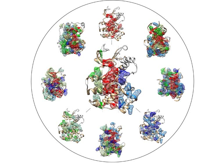 Our genomes encode thousands of proteins with multiple protein domains. Even though each protein domain is thought to perform a specific molecular function, how single protein domains such as the kinase domain (depicted in the image) are capable of performing multiple, complex functions has remained enigmatic. Using a novel computational method, named comparative coupling analysis, three distinct sets of residues (or as we call them protein sectors) performing different molecular functionalities were identified. The residues illustrated in red include the catalytic core of the kinase domain, the residues in green involve substrate specificity and residues in blue connect to sites of allosteric regulation more distant to the active site. I wanted to analyze the structural positioning of the residues forming the three different sets of residues (protein sectors) when superimposed on the structure of the kinase domain. As part of the analysis we not only considered the three protein sectors separately, but also in relation to one another.