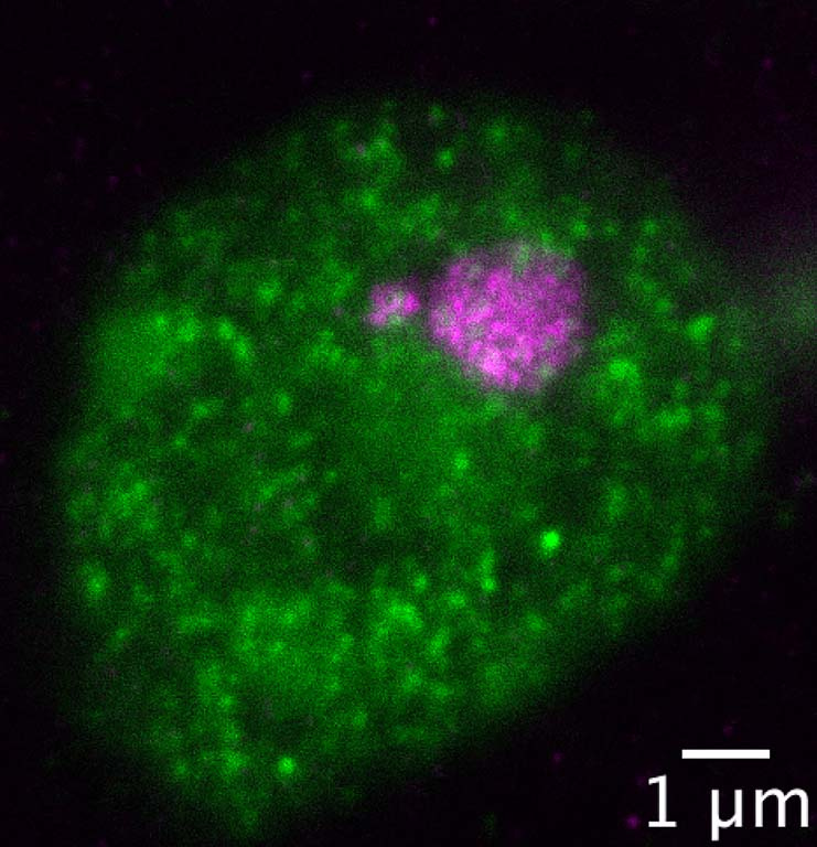 The image shows a section through the striatum of a mouse model of Huntington’s disease, a fatal movement disorder in which the neurons within the striatum die because of a mutation in the gene that encodes the Huntingtin protein. In this image, the mutant Huntington protein is imaged in magenta and can be seen forming a pathological inclusion inside of a neuron’s nucleus. The nuclear transcription factor TAF1 is labeled in green.