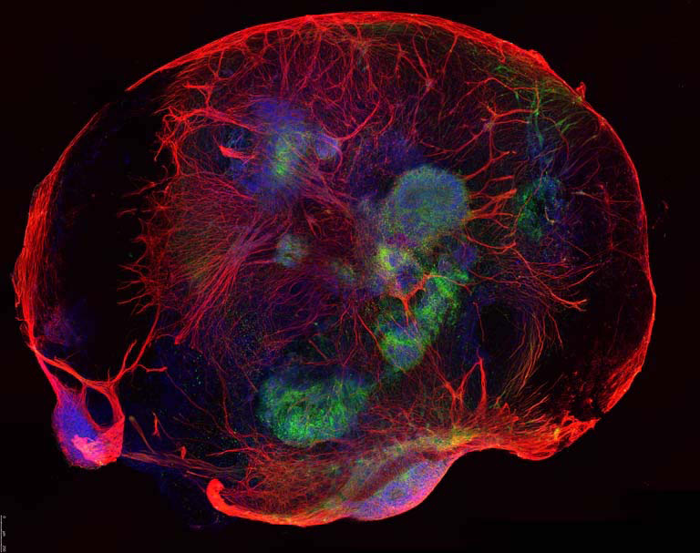 We are manipulating stem cells to recreate miniature versions of human organs. In this case we have instructed the stem cells to turn into an organ like brain tissue. My research was originally focused around investigating the effects of Prader Willi syndrome on the development of the brain; however while that aspect of my research could no longer be pursued, I still needed a model system to study development of the neocortex, which as seen through the image creates remarkably connected neuronal networks.