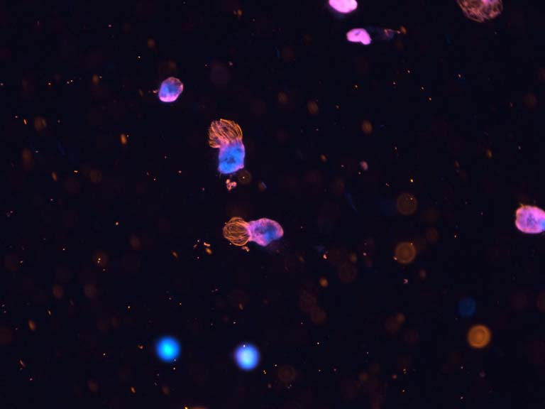 Megakaryocytes are differentiated hematopoietic stem cells and serve as the source of platelets in the blood. Although platelets and megakaryocytes have historically been studies for their primary role in blood clotting, we have elucidated that they also act as innate immune cells and are able to trap and phagocytize bacteria, like other white blood cells. This image is part of a series of experiments which demonstrate that megakaryocytes have innate immune cell function.