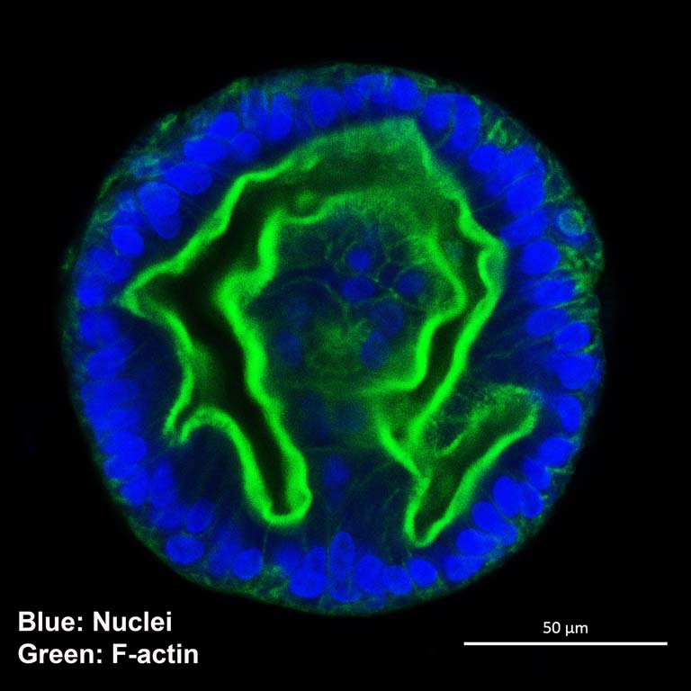 Intestinal stem cells isolated from human donors can be expanded in the lab. These cells form 3D spherical structures with an empty space in the center (called lumen) when embedded in an appropriated hydrogel (matrix) support. My work focusses on designing a synthetic hydrogel that would allow the expansion of the intestinal stem cells. This image represents a single intestinal organoid that has been induced for differentiation and thus show correct polarization.