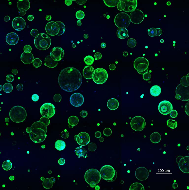 Intestinal stem cells isolated from human donors can be expanded in the lab. These cells form 3D spherical structures with an empty space in the center (called lumen) when embedded in an appropriated hydrogel (matrix) support. My work focusses on designing a synthetic hydrogel that would allow the expansion of the intestinal stem cells. This image represents a wide area of intestinal stem cells embedded in the synthetic hydrogel.