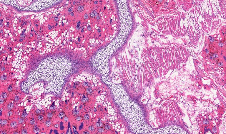 As a model, we present a sagittal cross-section image of a mouse ear that has been treated with a microneedle patch carrying an mRNA disrupting agent known as siRNA. The beautifully patterned circles like pebbles on a path are the cartilage cells in mice ears flaps while the long striated cells on the right are muscle cells. The hair follicles on the left are grouped as blue clusters with melanocytes (brown cells) while you can spot disc shaped red blood cells near big white fat cells. Hammond and Bhatia labs have joined forces to deliver these light-activatable drugs through the skin using an array of microneedles that can be further activated with light for the treatment of wound healing and cancer.
