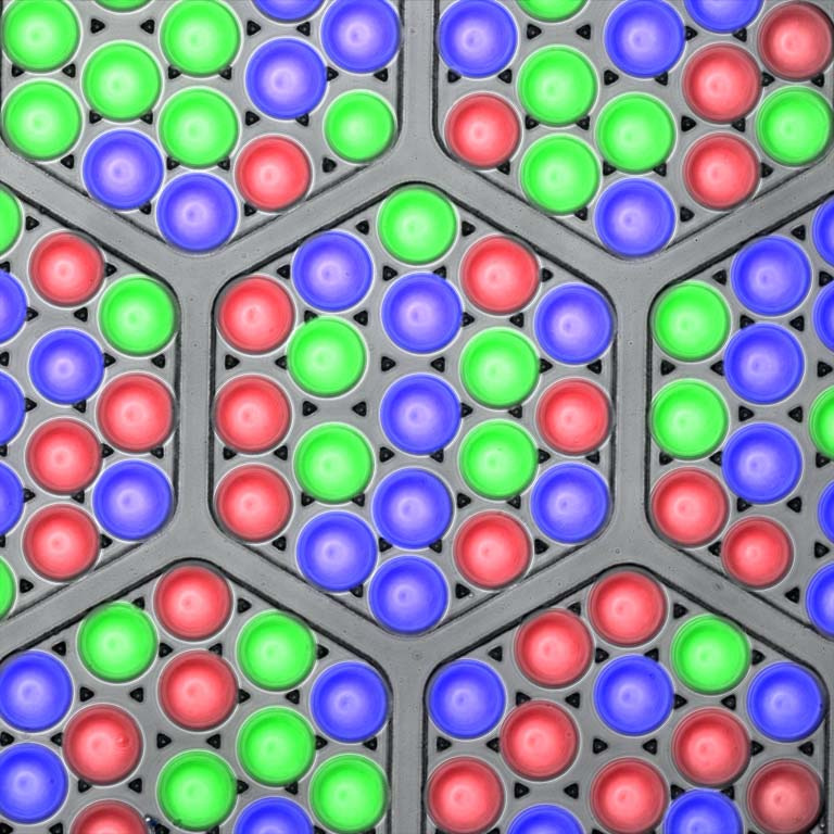 Let’s say you have a large collection of drugs—say, 100 in total—that you want to test in various combinations. That is, you want to screen combinations of drugs. It would take a lot of time to prepare and test every possible combination of 2 (~5000 in total) and much longer still to test larger combinations (sets of 3, 4, etc.). In fact, this problem grows intractably complex to do using any standard techniques. This new platform enables very rapid preparation of many 1000s of combinations. We put the drugs inside tiny droplets (1 nanoliter each), which then get randomly assorted into a large array of small wells designed to take a certain number of droplets. Droplet also receive a color barcode via a combination of three fluorescent dyes (red, green, and blue), which tells us what droplets were assorted into what well. From here, we can merge the droplets within their well to generate the combination.