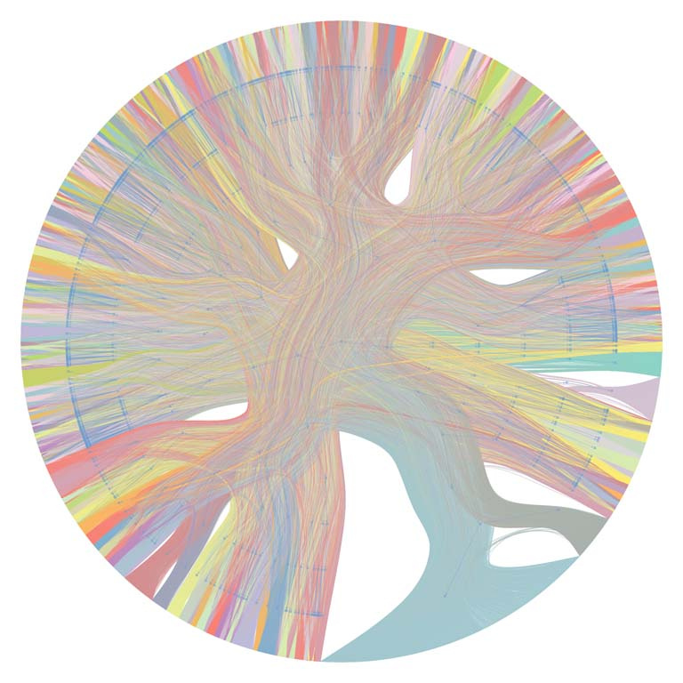 This image is a visualization of the results of an algorithm seeking to “disentangle” the protein-protein interaction network released a couple months ago by the Lage lab at the Broad (named “InWeb_InBioMap”). The goal of the algorithm is to understand the organization principles of the proteome, and by extension, human biology. Using the protein communities discovered by the algorithm, we can infer the existence of functional modules and complexes – systems of proteins acting in exquisite concert. I made this picture to visualize the output of my algorithm, to get a first peek at what it had discovered. I then went through and rigorously analyzed the results.