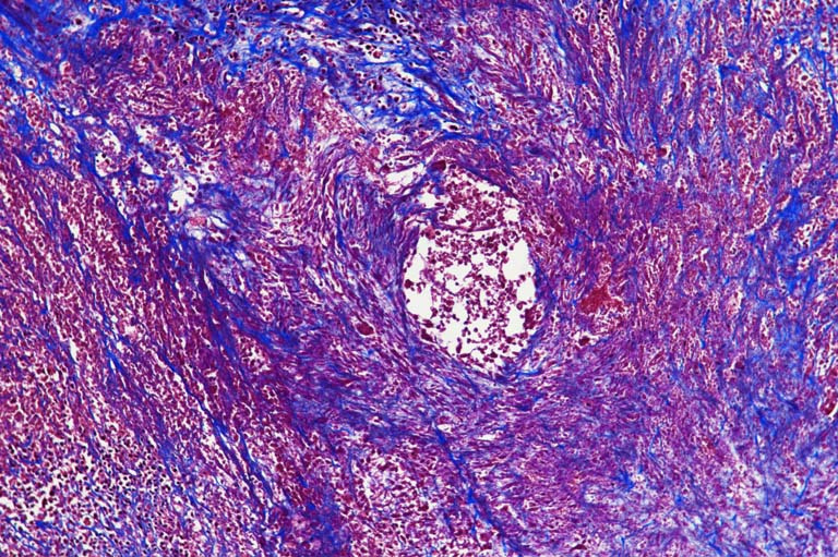 These are images of sections of tumors that have been stained to try and understand what is happening inside the tumor. Using this stain we can tell apart live cells from dead cells and we can see whether the tumor cells have started building up extracellular matrix. In these images you can see how complex the inside of these tumors are--there are pink dense live cells, less dense and more purple dead cells, and there are swaths of blue stained extracellular matrix (specifically collagen). In some of the images the extracellular matrix delineates a border between zones that have dead cells or live cells, whereas in other images, the extracellular matrix completely intertwines with either zone.