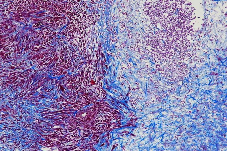 These are images of sections of tumors that have been stained to try and understand what is happening inside the tumor. Using this stain we can tell apart live cells from dead cells and we can see whether the tumor cells have started building up extracellular matrix. In these images you can see how complex the inside of these tumors are--there are pink dense live cells, less dense and more purple dead cells, and there are swaths of blue stained extracellular matrix (specifically collagen). In some of the images the extracellular matrix delineates a border between zones that have dead cells or live cells, whereas in other images, the extracellular matrix completely intertwines with either zone.