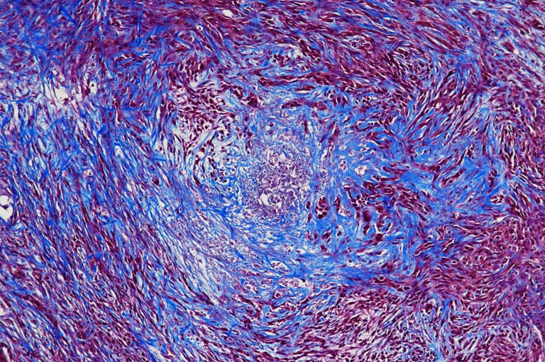 These are images of sections of tumors that have been stained to try and understand what is happening inside the tumor. Using this stain we can tell apart live cells from dead cells and we can see whether the tumor cells have started building up extracellular matrix. In these images you can see how complex the inside of these tumors are--there are pink dense live cells, less dense and more purple dead cells, and there are swaths of blue stained extracellular matrix (specifically collagen). In some of the images the extracellular matrix delineates a border between zones that have dead cells or live cells, whereas in other images, the extracellular matrix completely intertwines with either zone.